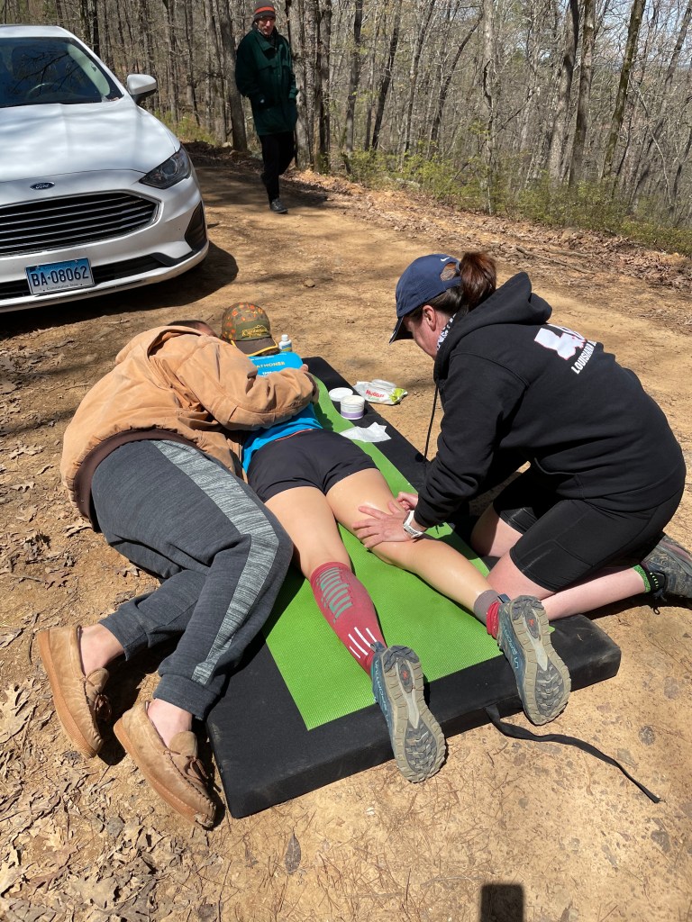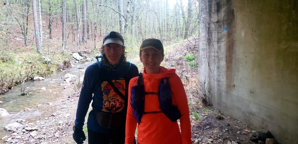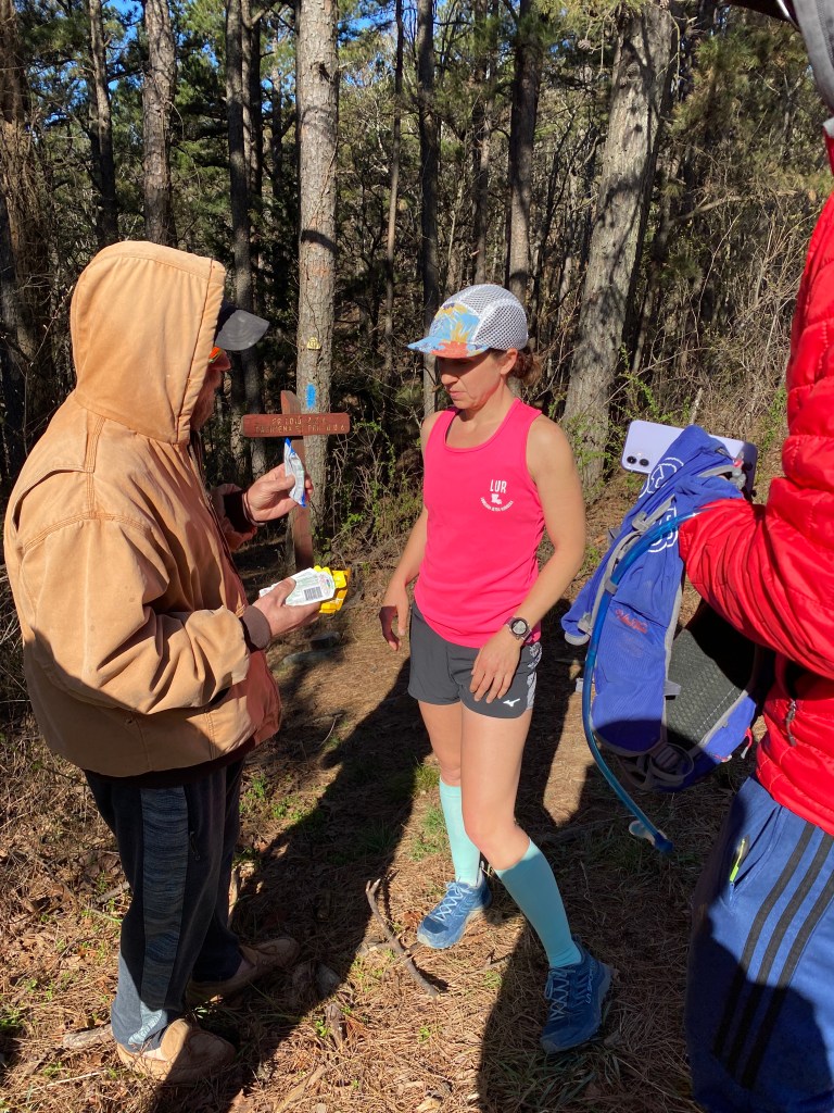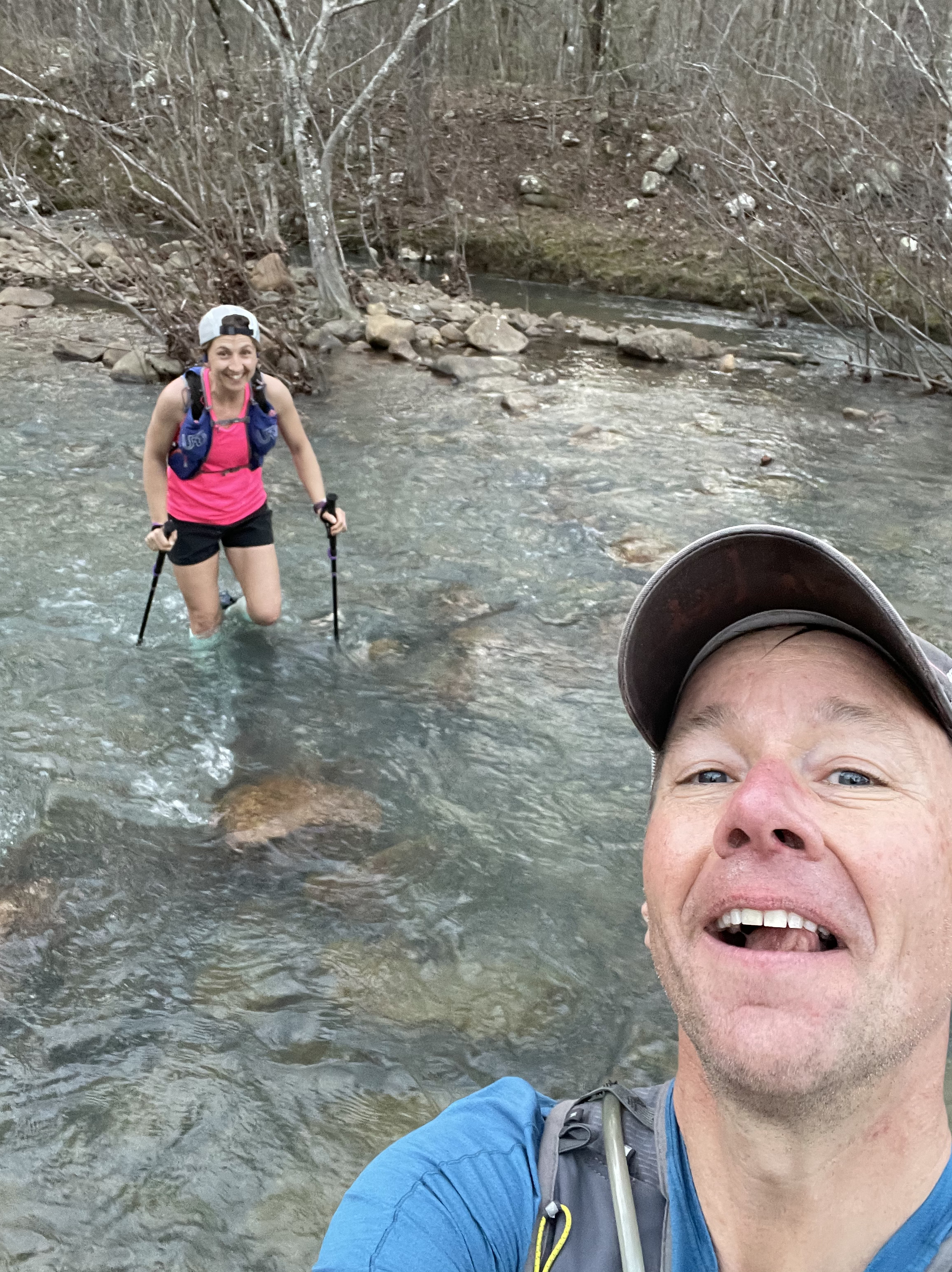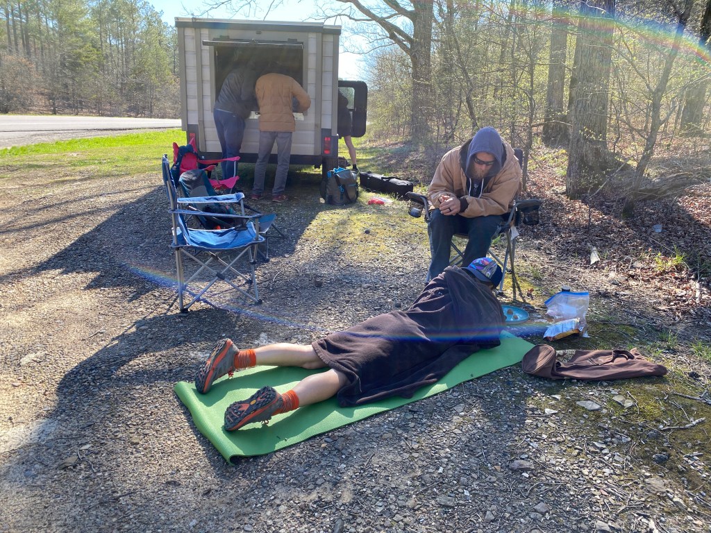 Once I picked up Jeremy for a 12 mile section I had lost a decent amount of time compared to my plan and was still trying to navigate my stomach distress. The section with Jeremy dropped us down into the valley and we had to cross the gorgeous Kiamichi River about 8 different times. Even with the sunlight and cold water crossings, I was finding myself nodding off a bit. Jeremy tried to help as best he could but I knew something just wasn’t right with my nutrition for me to be experiencing stomach distress and nodding off- not from fatigue as I felt pretty good- but from some kind of imbalance of electrolytes or nutrition…I really wasn’t sure but I was having to really focus with each step I took. Luckily, putting on music helped me click through some miles until I arrived at the State Line aid spot to get some help diagnosing what was going on.