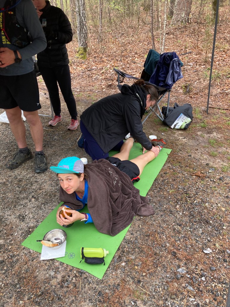 Massages from Edie were the biggest factor! I also just ran on sore and tired legs. I did utilize Ibuprofen sparingly in the last 30 hours as well.