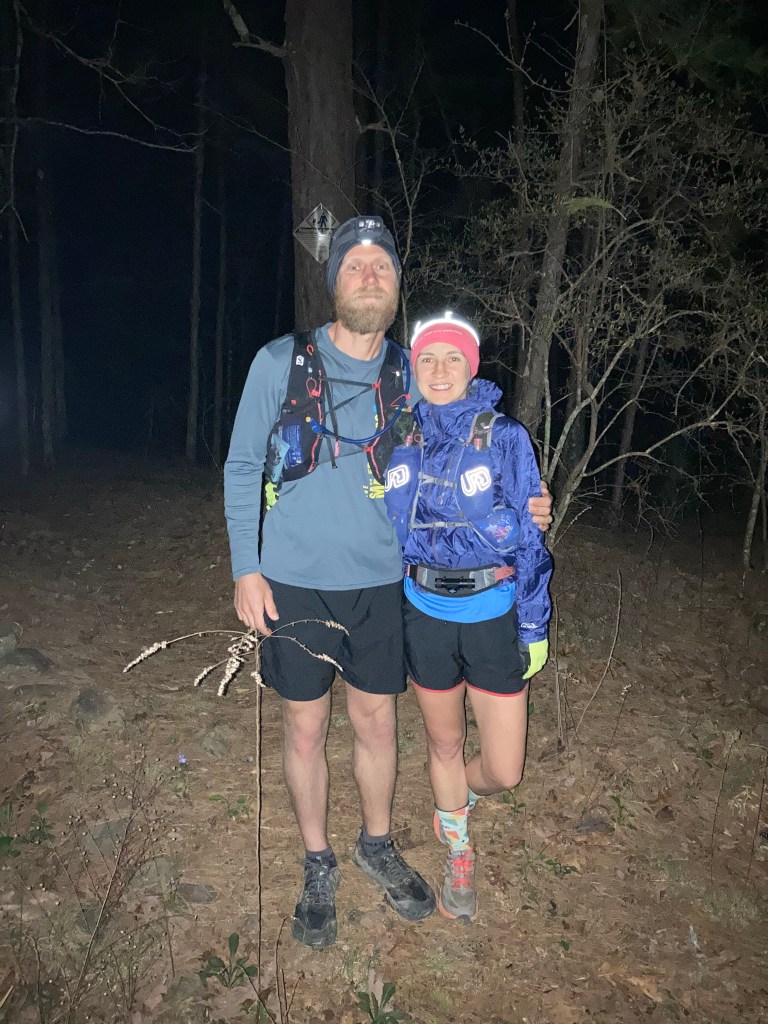 When I arrived at the aid station, I announced to my crew, “I only have 90 miles left! Woo hoo! And now I’m going take a nap.” While Jeremy was at the next aid spot waiting for me since he would be running with me later, he had pre-cooked a hearty potato, egg, and cheese burrito. That was the perfect pre-nap meal and I passed out right after eating it. Awaking after my 20 minute nap, I felt significantly better and set out with Miranda and Emily for a 5 mile section. This was Miranda’s second trail run ever so for those of you that know these two ladies you can imagine how much we laughed. I was still really cold after a half mile of climbing on the trail so Emily sprinted back to the aid spot to get me a jacket. She barely got there before the crew left. It was taking her longer than expected to return so Miranda went to find her. I found myself alone on the trail laughing at the current situation on a short 5 mile section. When the ladies returned we laughed about it together. After all of Emily’s hard work to get me that jacket, by time she reached me I had warmed up. The nap and laughter helped carry me for many miles after I started running the last section of the day- a 22 miler with Jeremy.
