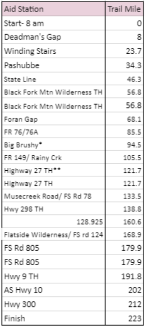 Here are the aid spots I designated as meet up spots with my crew. I would sit, eat, diagnose issues, swap gear, be updated on any weather or trail conditions, and get massages.