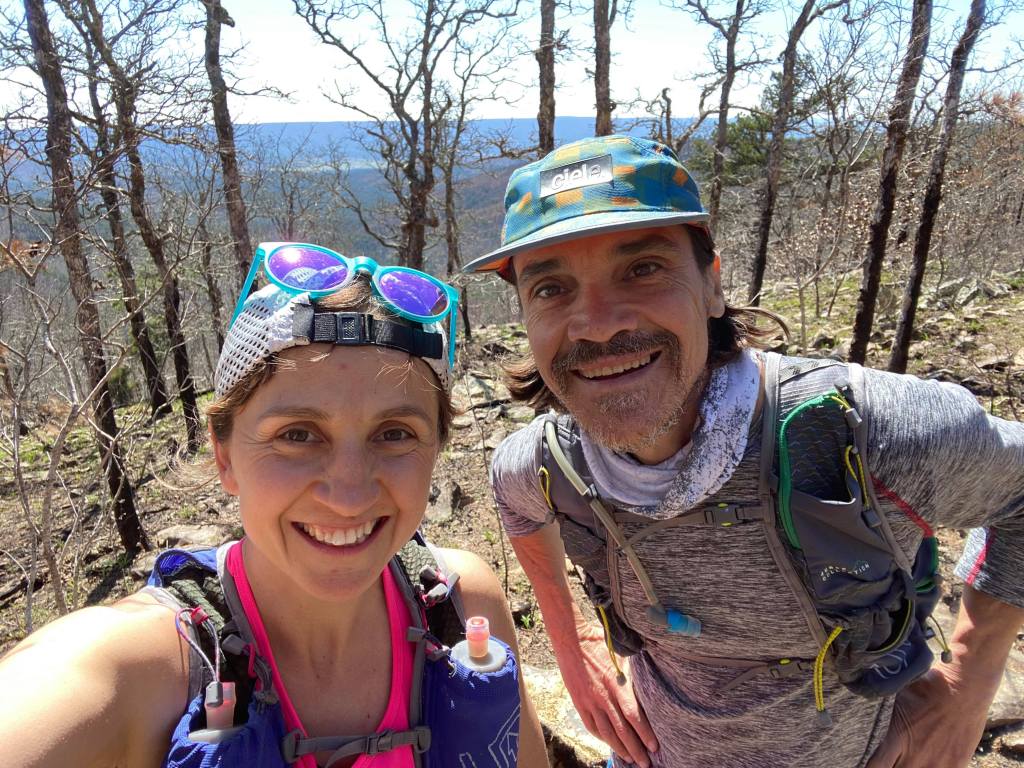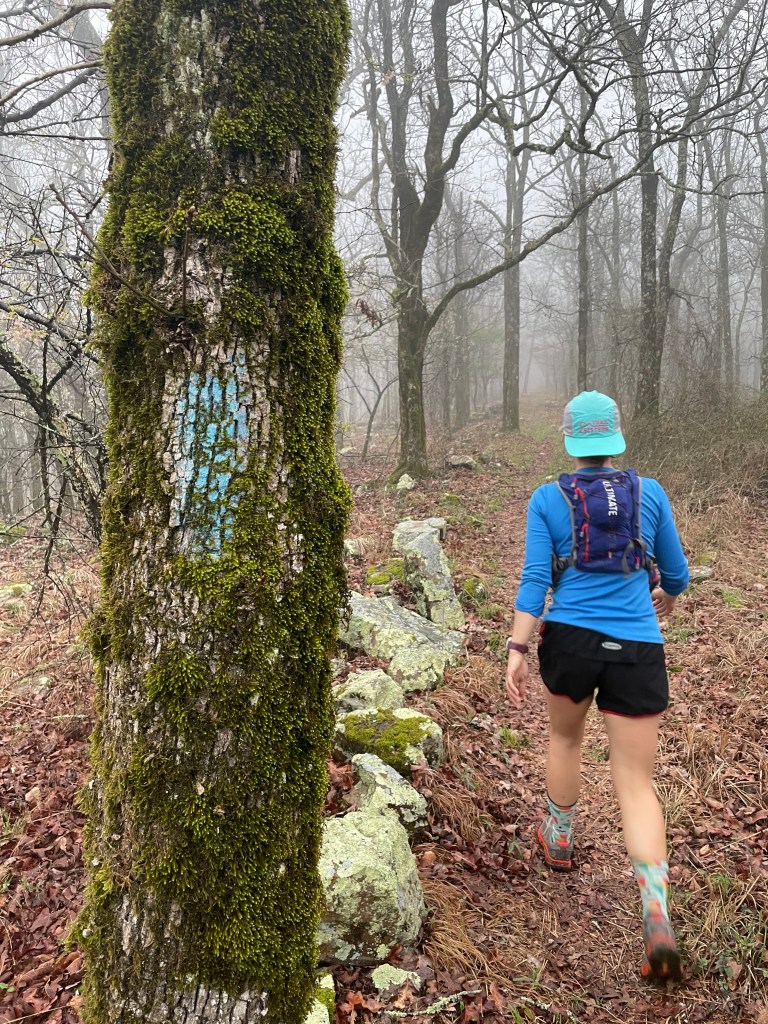 Once we hit the road heading east to Talimena State Park, my nerves kicked in and I was immensely grateful for the unexpected time I was able to spend earlier that morning centering myself before such a big undertaking. In turn, we were treated to a spectacular moonset and sunrise throughout the mountainous drive and even saw several deer and a foxing scurrying into the woods. Just like that, my crew was counting me down to an 8:00 a.m. start and I was off. I’d run this section of trail before but had forgotten the trail starts with a winding mile or so uphill. I kept looking at my current pace and worrying that I was already falling off my planned pace. This was the perfect opportunity to remind myself of why I wanted to take on this run in the first place. I was there because the magic of the trail beckoned me. I was there to honor my dad who had unexpectedly died at the age of 59 from COVID-19 two months before. I was there to dig deep and to learn and grow and accept myself and what was without the need for perfectionism. I was there as an expression of resiliency. With those reminders, I settled in and switched my watch from showing my pace and distance to just showing the time of day and allowing the data to be tracked in the background.