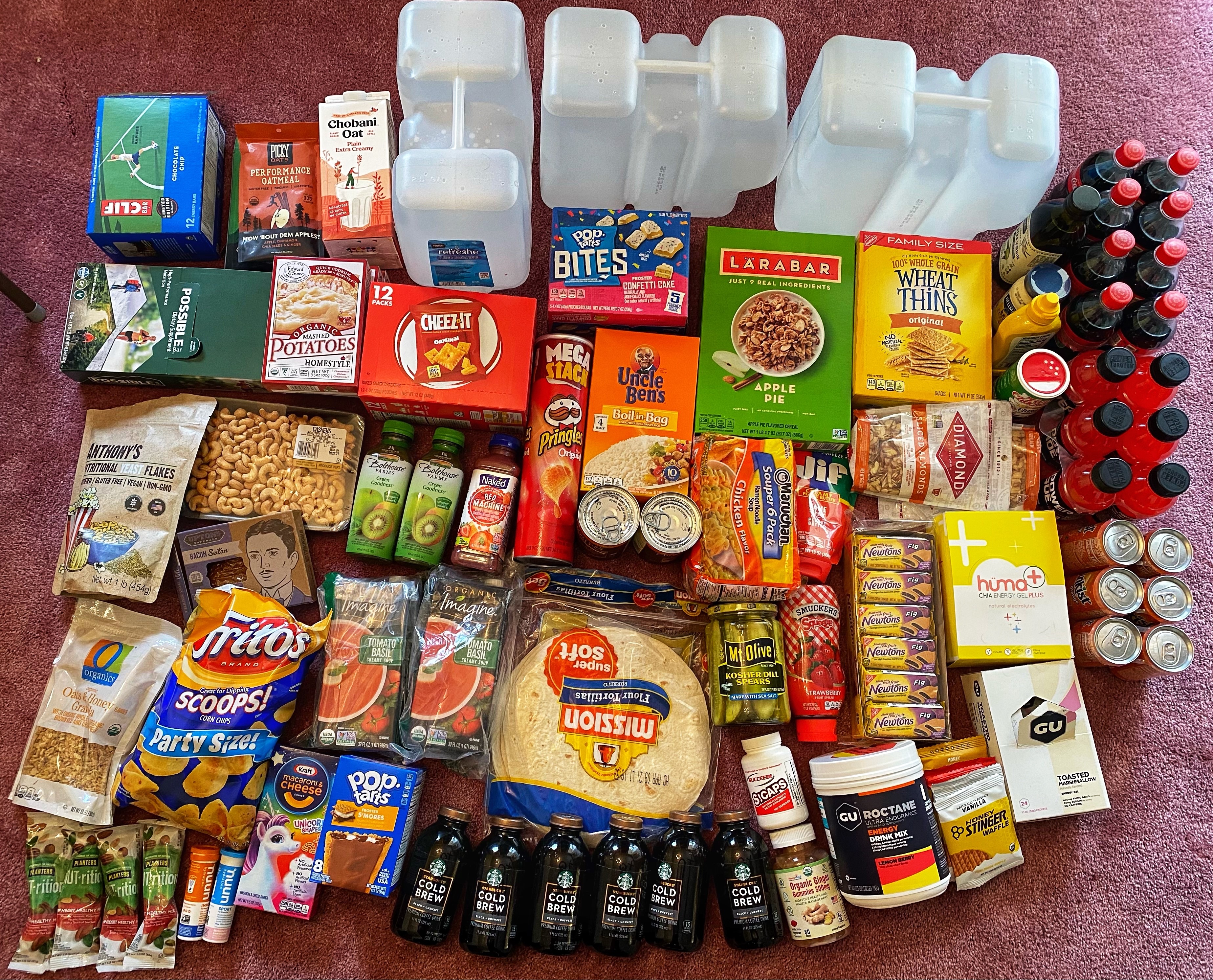 There’s a picture above of my non-perishable items and I mentioned many meals I ate along the way. As I stated in the blog, I tried to get in about 4,000 calories daily. That consisted of Stinger Waffles, Fig bars, Clif Bars, Cheez-its, and many other things!